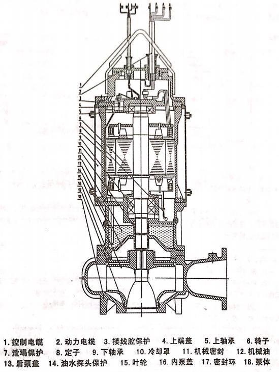 QW系列潛水排污原屬于立式下泵型結構,由電動機、水泵和密封裝置三大部分組成,電機與水原同軸一體潛入水中工作,產品結構見圖2